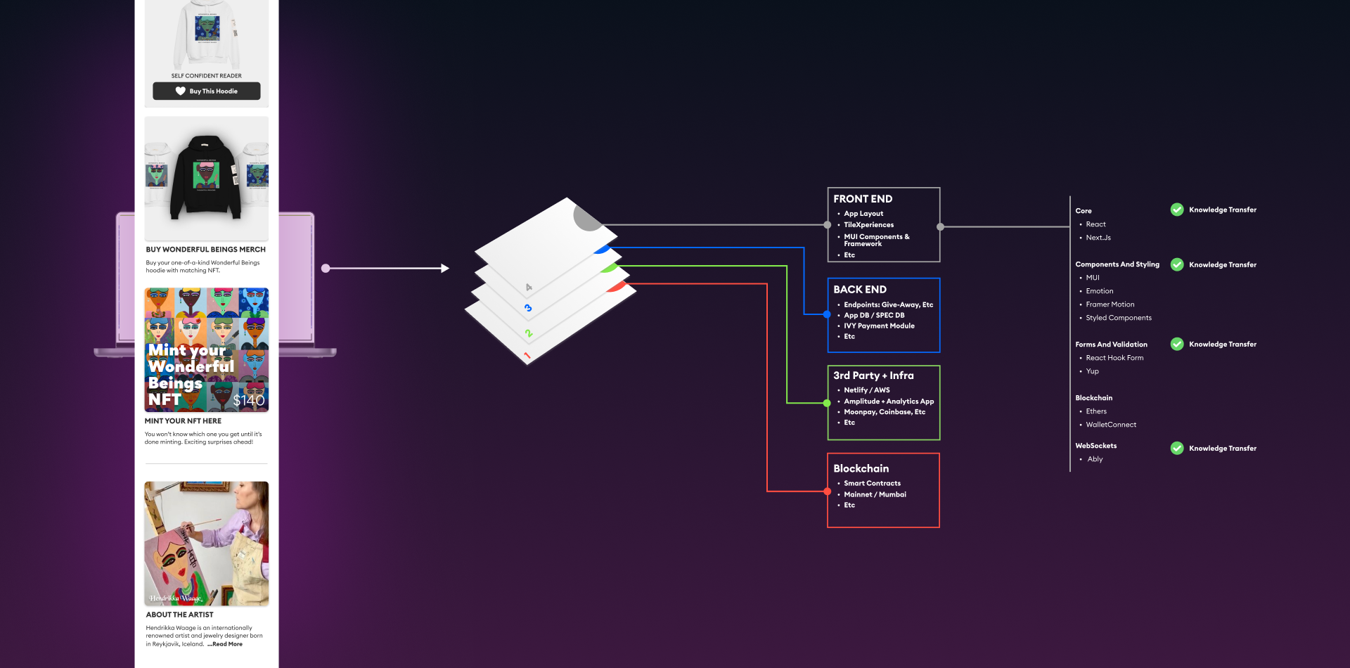 Deep blockchain and NFT understanding informed every decision. This wasn't surface familiarity with buzzwords. We understood the difference between ERC-721 and ERC-1155 tokens and when to use each. We grasped how gas costs affect user experience. We knew how royalty mechanics work across primary and secondary markets. This knowledge shaped architecture choices, feature prioritization, and business model design throughout the engagement.