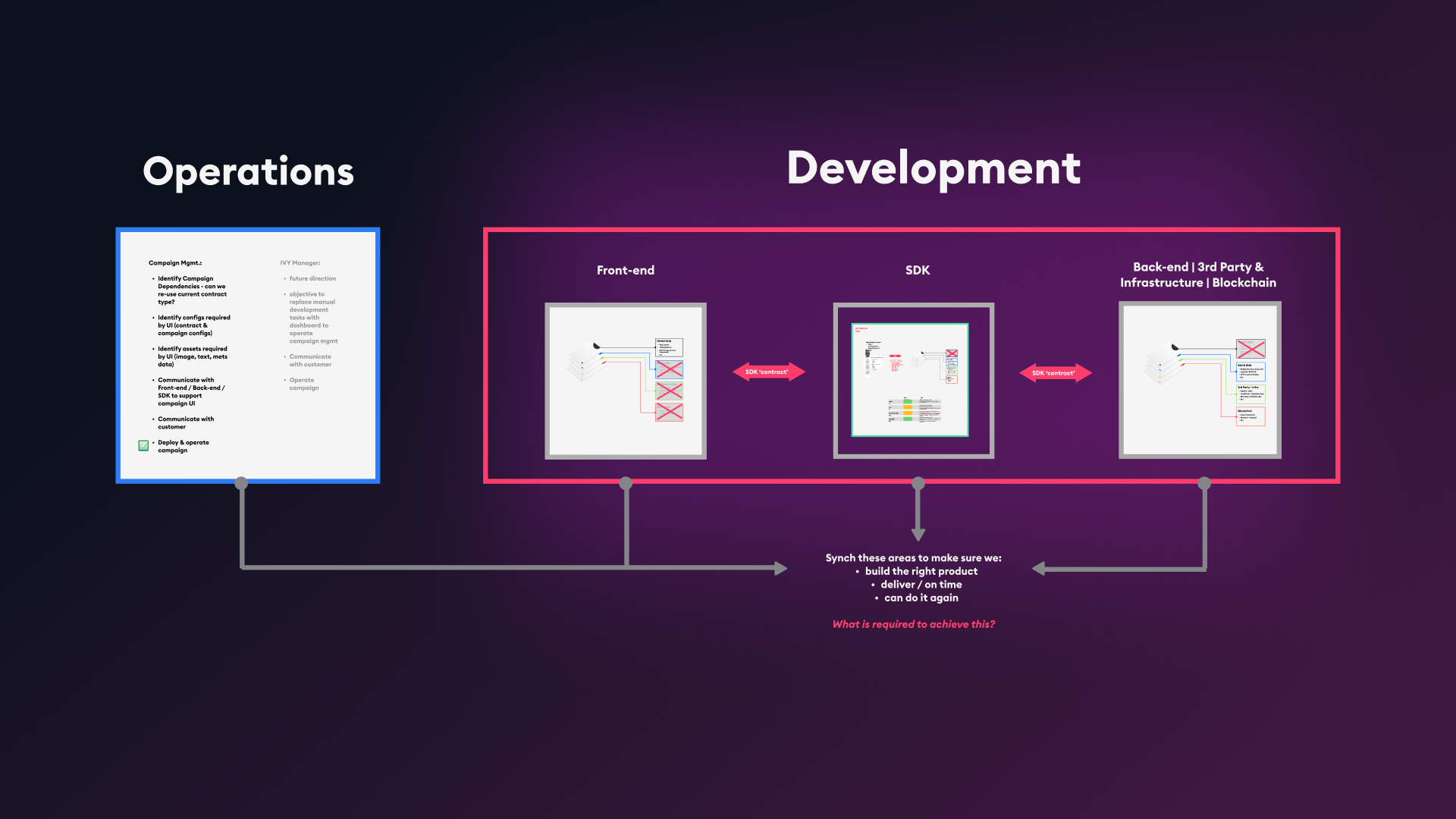 Every framework, drawing, and visual plan the team used to stay aligned - we created it. The role accountability matrices defining who does what. The ceremony agendas specifying outcomes and attendees. The SDK roadmap coordinating six parallel work streams across four sprints. The Platform vs. Operational Qualities framework guiding investment decisions. The 6-month delivery roadmap tracking Product, Dev, UX, and Development in parallel. These weren't reference documents collecting dust. They were the operating system the team ran on daily.